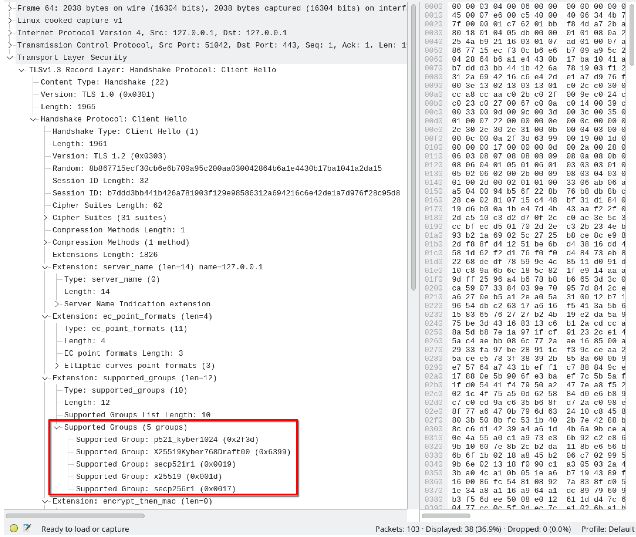 It only took 13 lines of code to actually make the changes necessary in the SoftEtherVPN source code. Most of the difficulty came in research and reading the source to familiarize myself with how everything functioned. The only thing that was changed is loading and unloading the provider, and calling SSL_set1_groups_list. It really is that simple; checking the ClientHello packet in Wireshark, we can see that the client really does try to negotiate a post quantum key exchange.